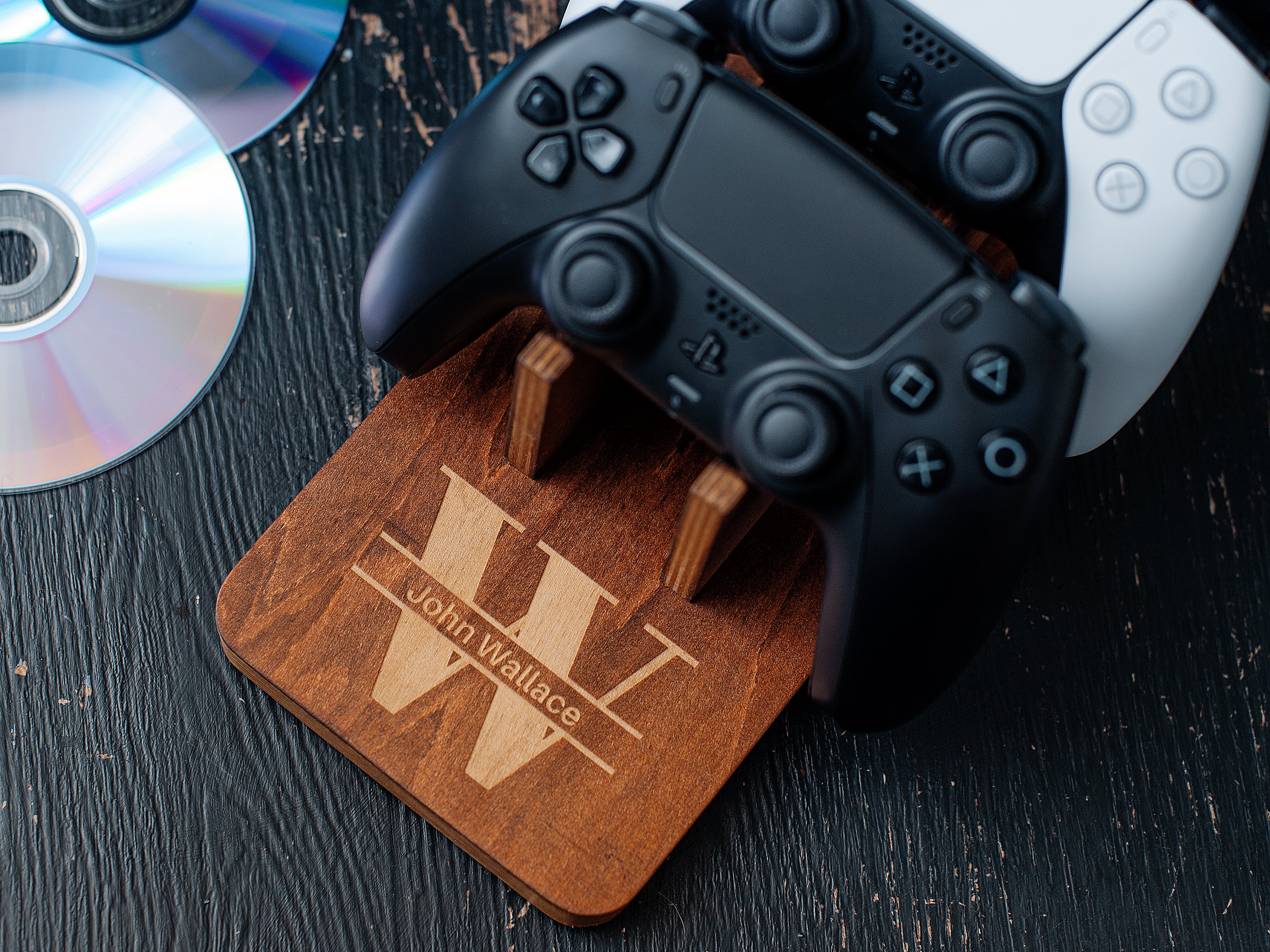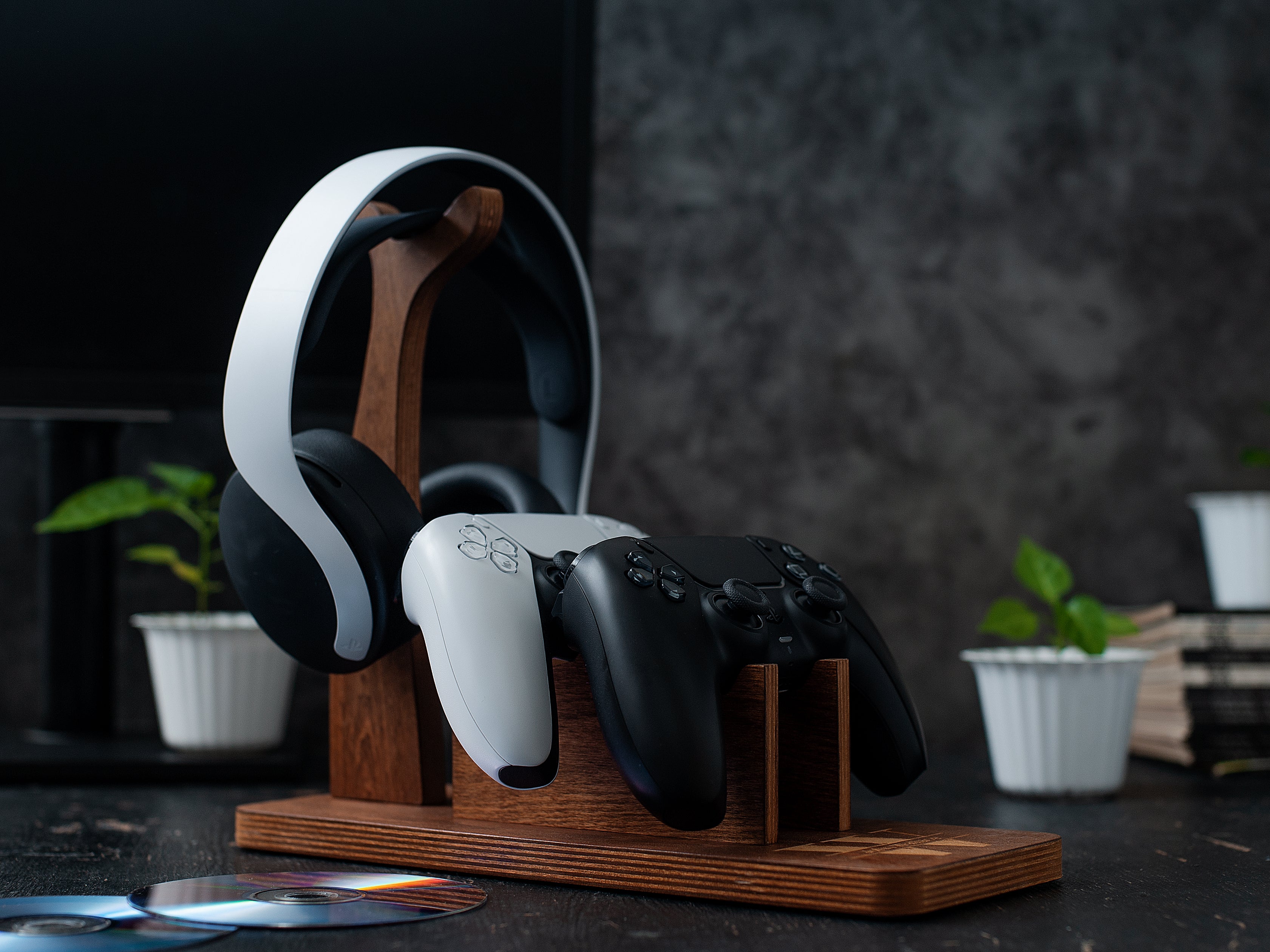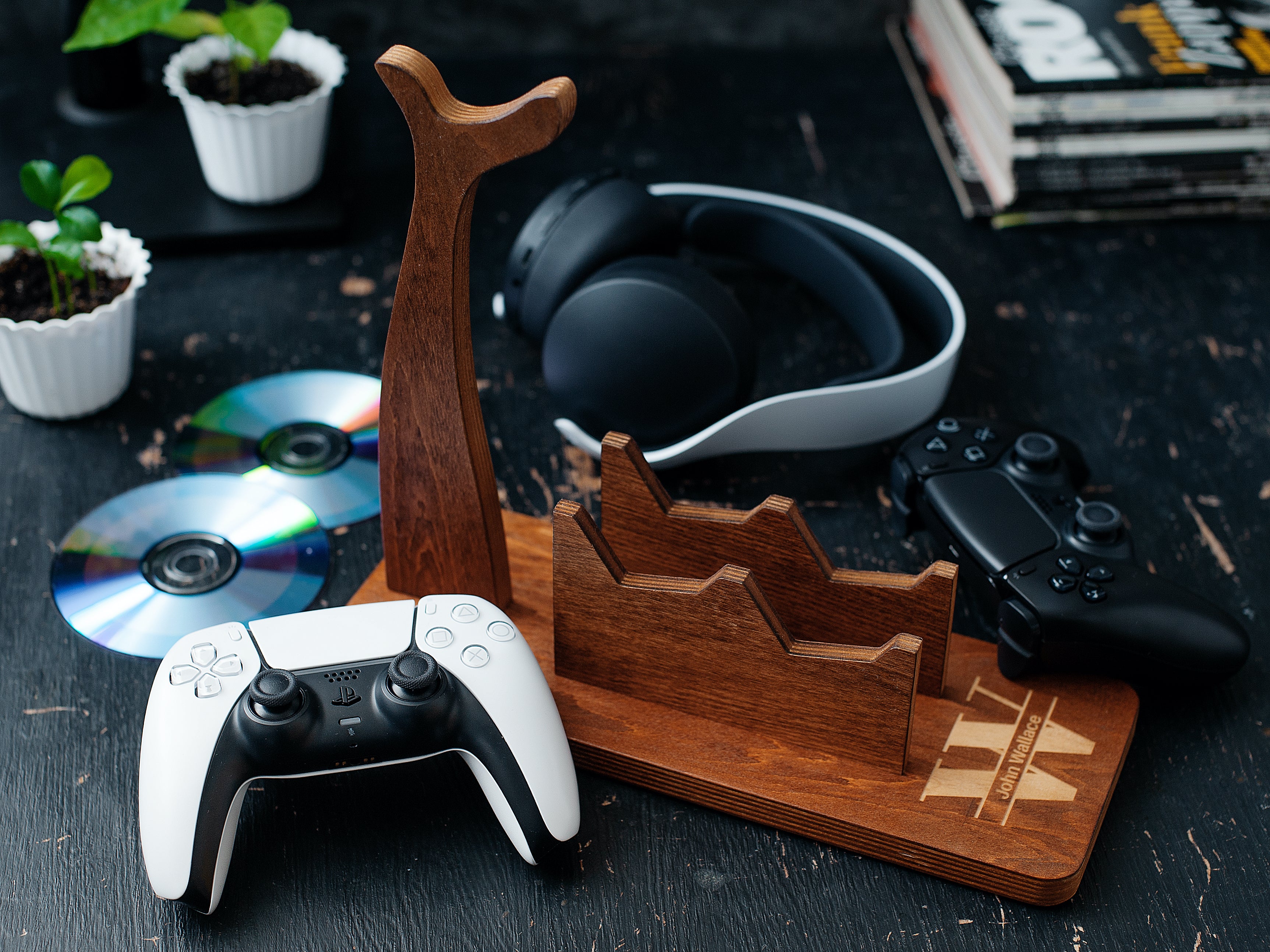 Our handcrafted stand isn’t just for storage — it’s a sleek way to upgrade any gaming setup. With space for two controllers and a headset, it keeps things tidy while adding a modern touch to the room.